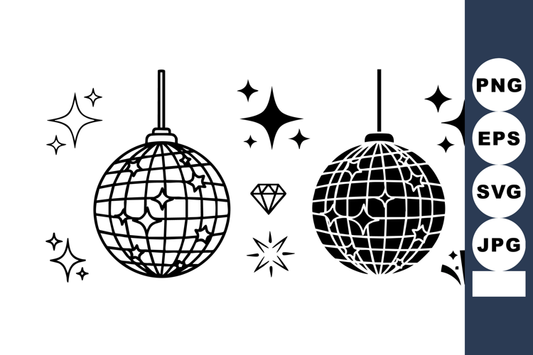 Vector shows two disco balls with various shining stars and diamond sparkles in simple black outline style, creating a festive and energetic mood.