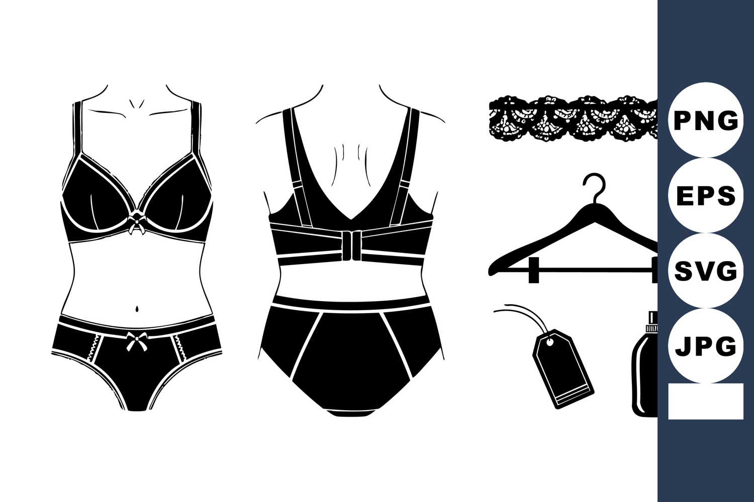 Vector illustration shows female lingerie including bra and panties with accessories like hanger, lace band, tag, and bottle in monochrome style. Minimal and clear design, elegant mood.