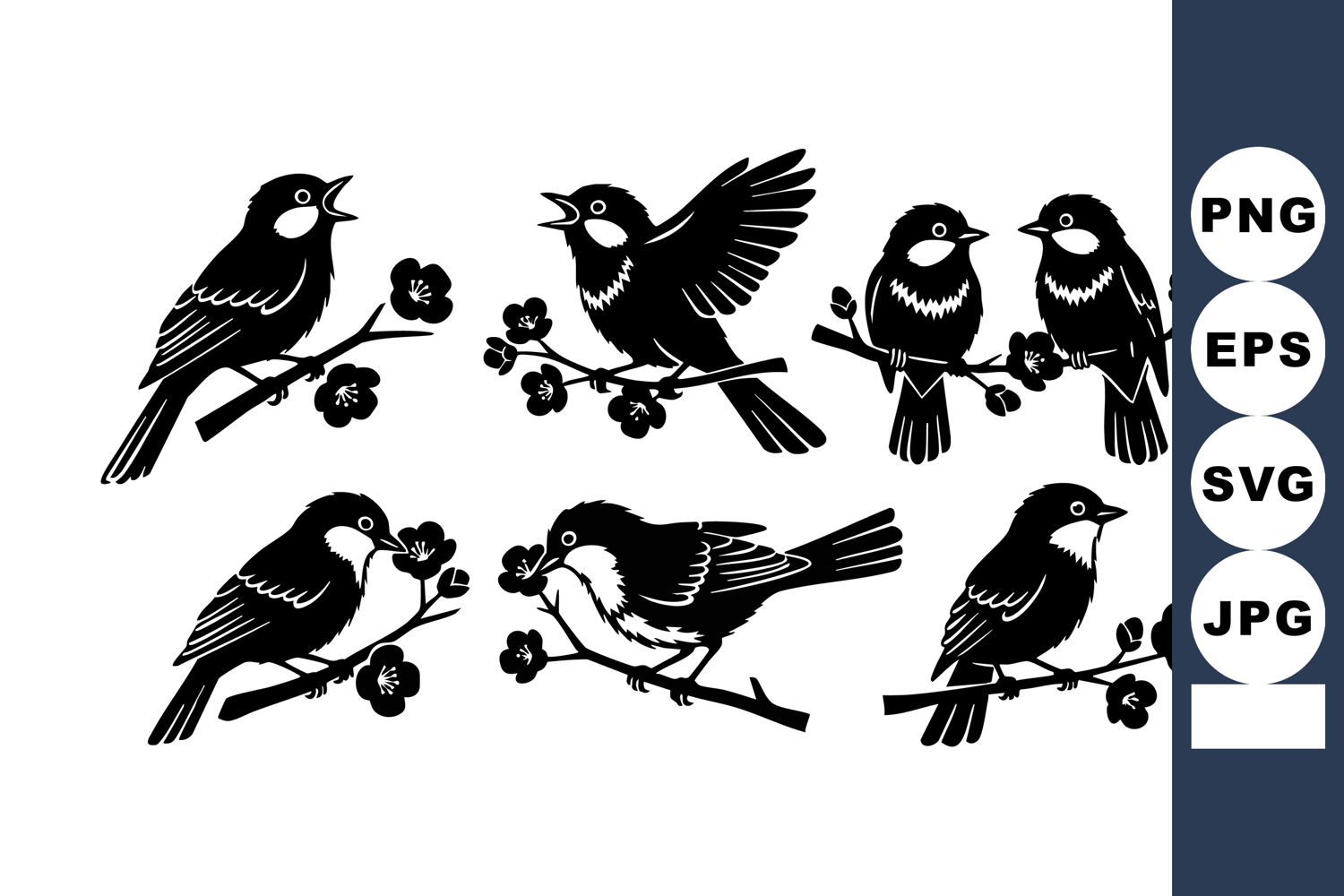 Vector art shows small birds perched on blossoming branches in black silhouettes, capturing natural elegance and peaceful wildlife charm. Ideal for nature-themed, decorative, or artistic projects. Calm mood.