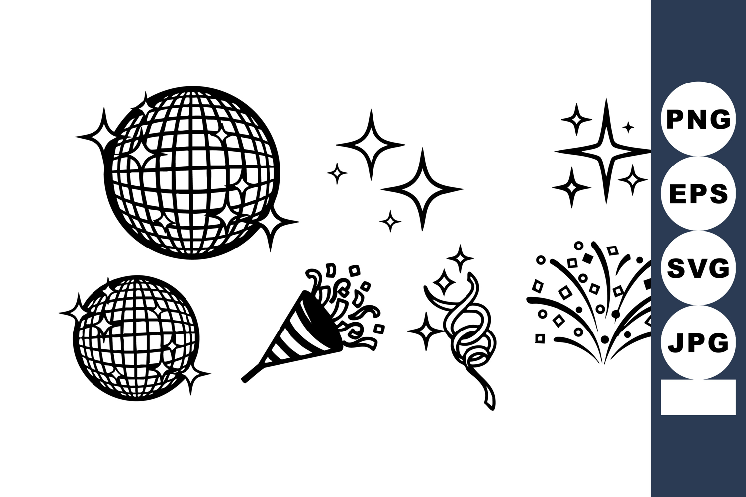 This vector shows sparkling disco balls, confetti, glitter stars, and party poppers celebrating a festive occasion with joyful energy and vibrant mood.