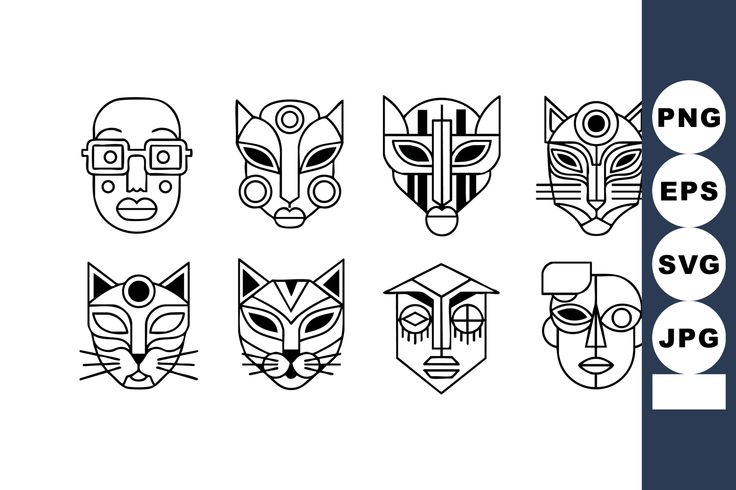 This vector presents eight abstract minimalistic face masks combining animal and human features in black and white geometric designs. The style is tribal and modern, artistic mood.