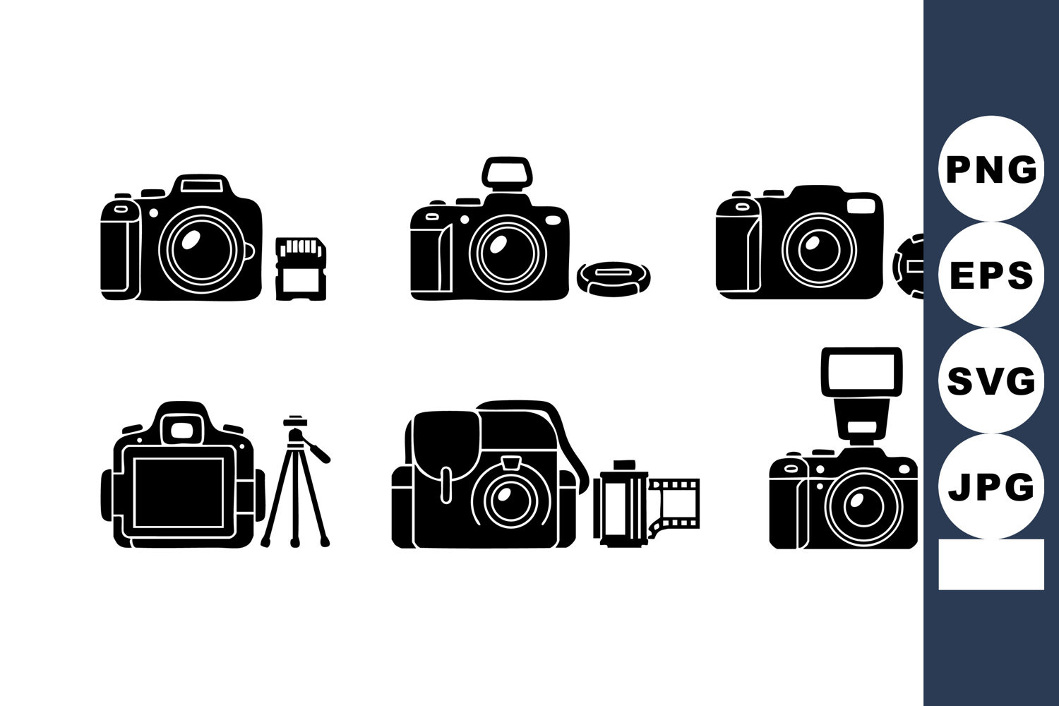 This vector features professional camera icons with various accessories including lenses, flash, and tripod, ideal for photography and technology projects. Modern and sleek style.