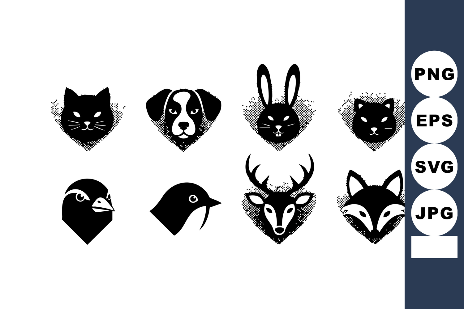 This vector design features black silhouettes of animal heads including cat dog rabbit fox deer and birds in a clean and bold style. The mood is striking.