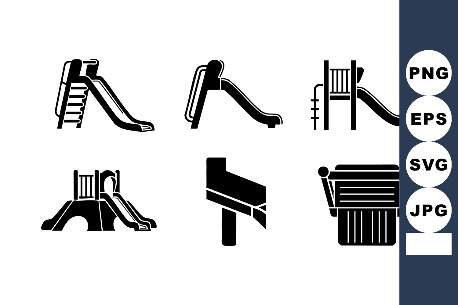 Vector icons featuring playground slides with ladders and climbing frames in solid black silhouette style, suitable for children’s play area design, clear and minimalistic. Functional and playful.