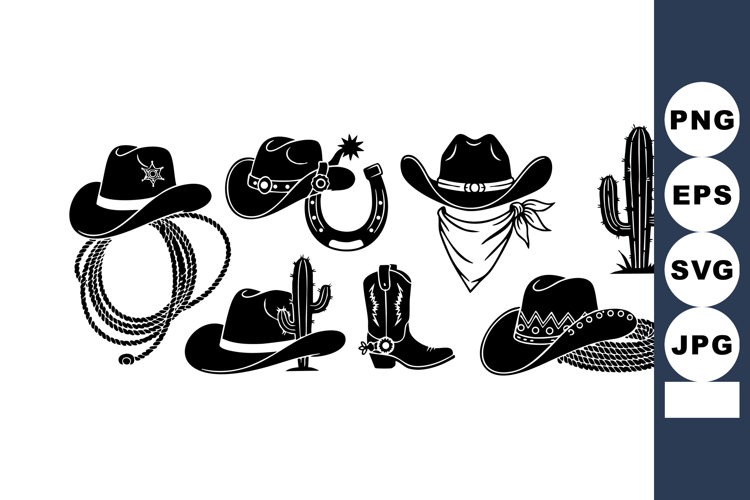 Vector displays various cowboy hats, rope, horseshoe, cactus, boots, and bandana in black silhouette style, representing western theme with rustic and rugged mood.