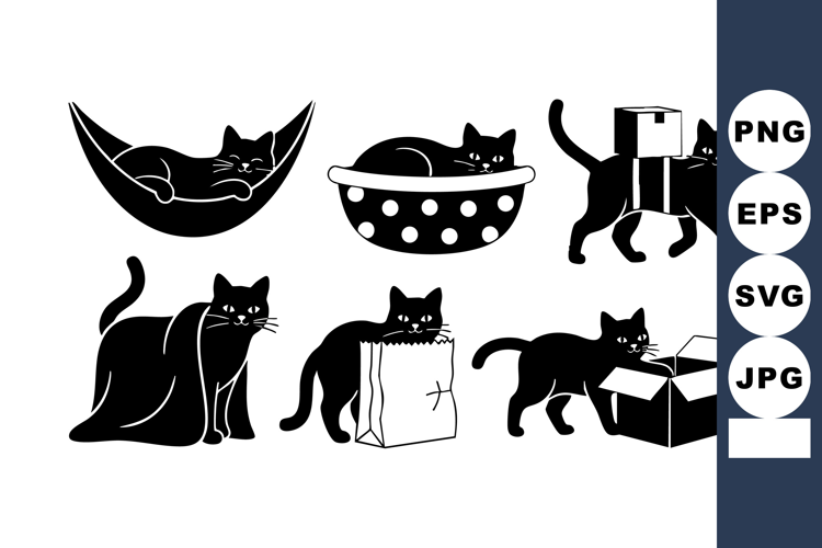 Vector illustration features black cats in various playful poses inside a paper bag, box, bowl, and hammock, all in silhouette style. Fun and lively mood.