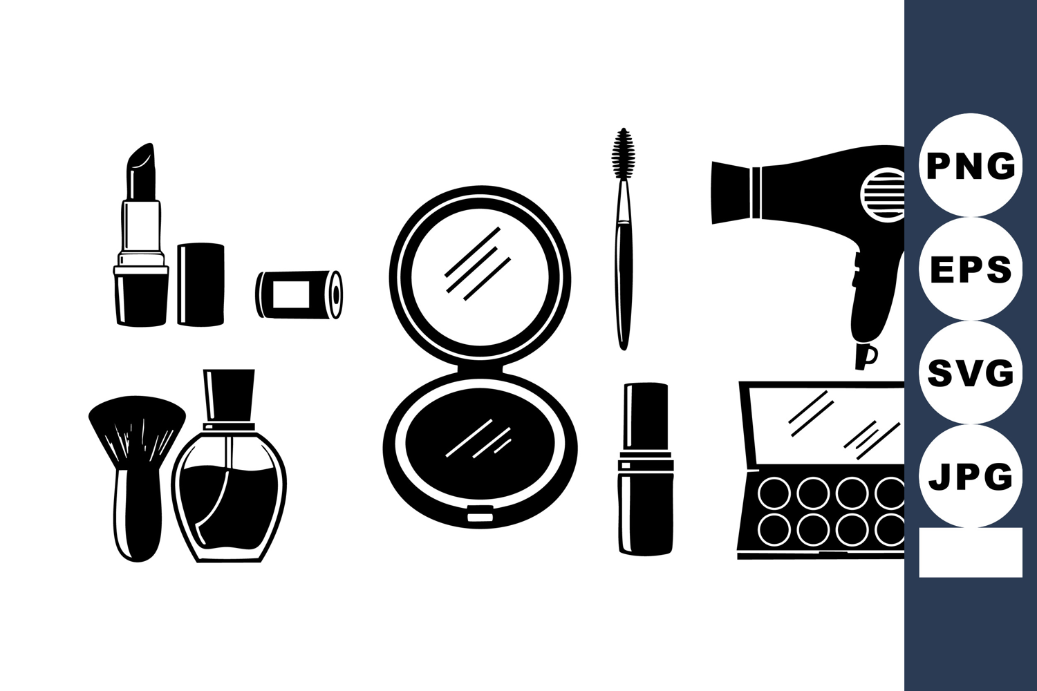 Black silhouette vector icons of various cosmetic makeup tools and beauty products including lipstick, mascara, powder brush, compact mirror, and hair dryer, presented in clean style. Elegant.