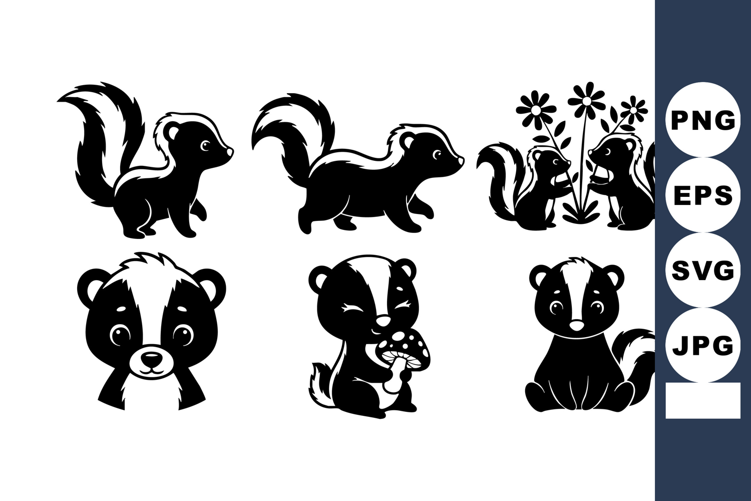 This vector features six cute skunk silhouettes including playful poses with flowers and mushroom elements in black and white style for nature-themed design projects. Charming and whimsical.