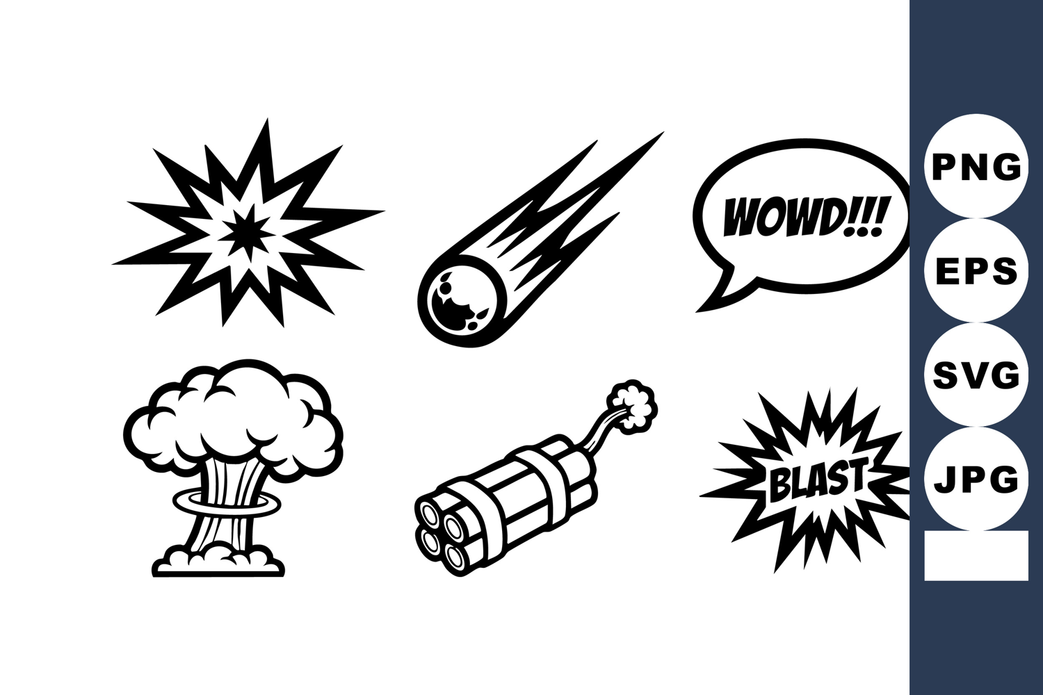 Vector graphic displays comic style icons including explosion, blast, dynamite, meteor, and wow speech bubble in black and white. Design appears bold and energetic. Dynamic mood.