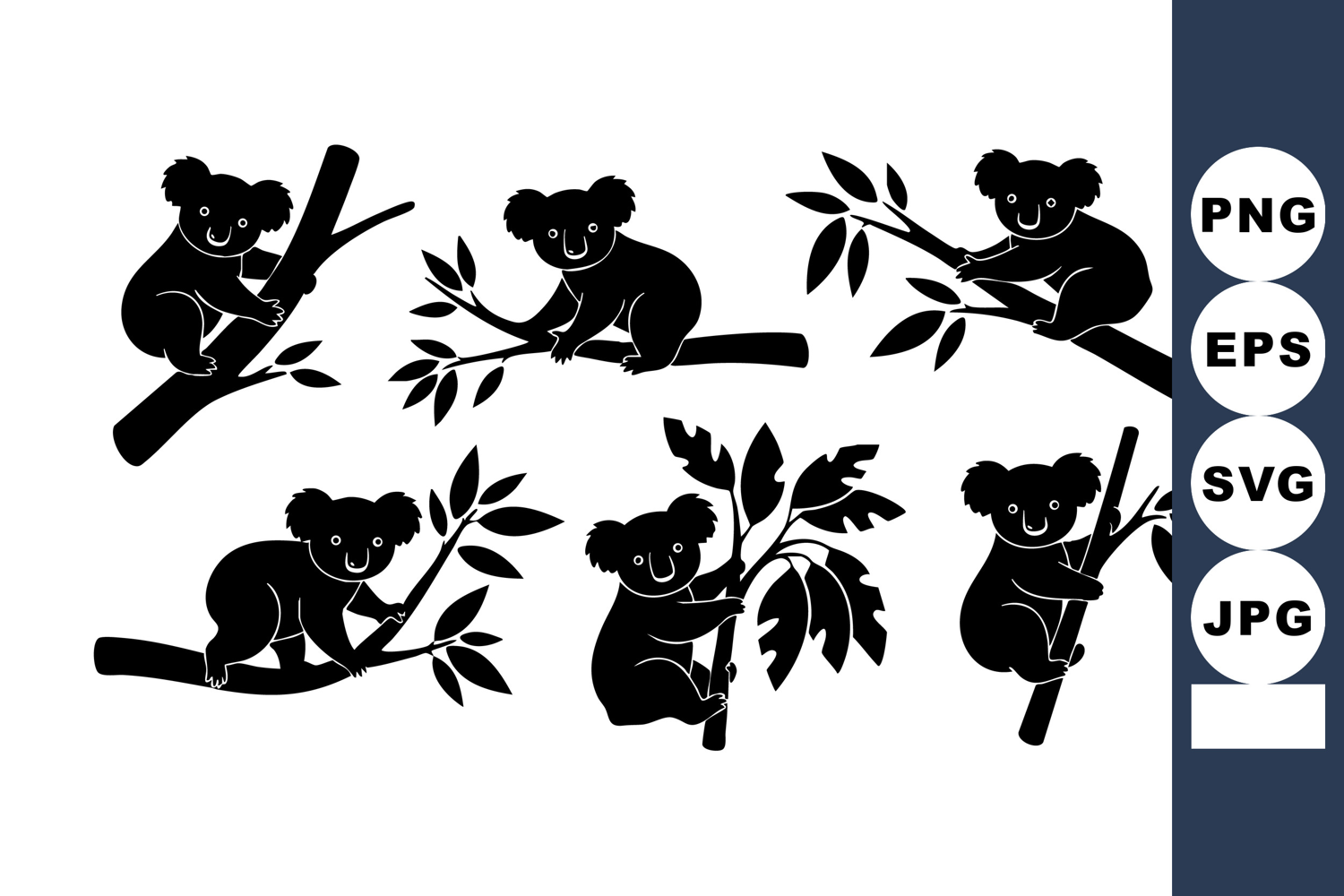 This vector features six black koala silhouettes climbing and resting on tree branches with leaves, showcasing natural animal behavior and wildlife in a simple design. Calm and peaceful.