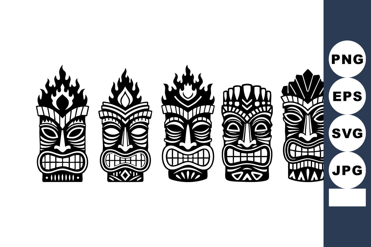 Vector art presents five Polynesian tiki masks in black silhouette with tribal designs and flaming crowns, showcasing cultural motifs and artistic expressions, creating an intense and mysterious mood.