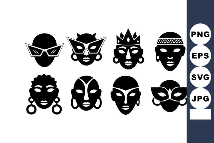 This vector image presents a collection of eight African tribal masks in black silhouette style, showcasing diverse traditional cultural designs. The masks convey heritage and artistic expression, inspiring creative use. Cultural, artistic mood.