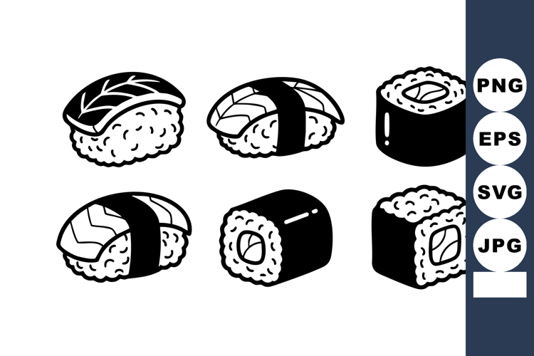 This vector features a variety of sushi types including nigiri and maki rolls in simple black and white style, perfect for Japanese cuisine designs and food-related projects. Crisp and clean.