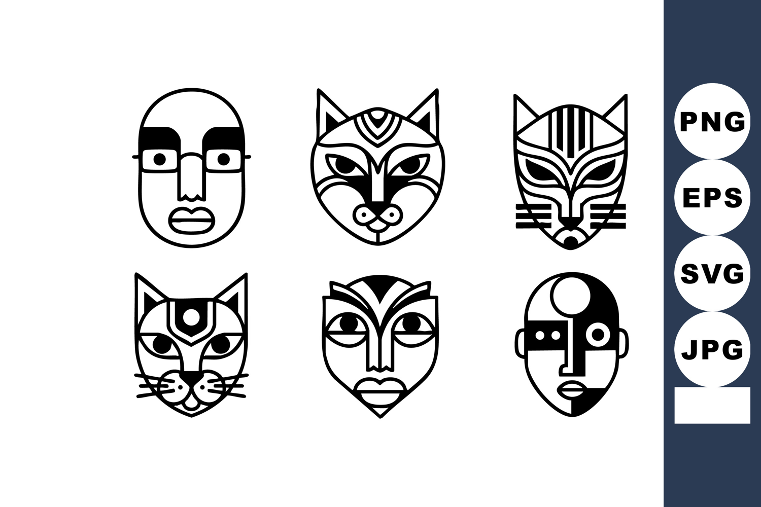 This vector features abstract black and white geometric faces of animals and humans with symmetrical tribal patterns, showcasing minimalist and artistic design. The style is modern and intriguing.