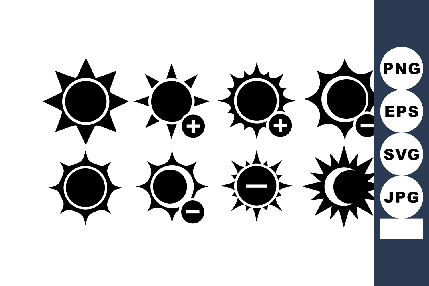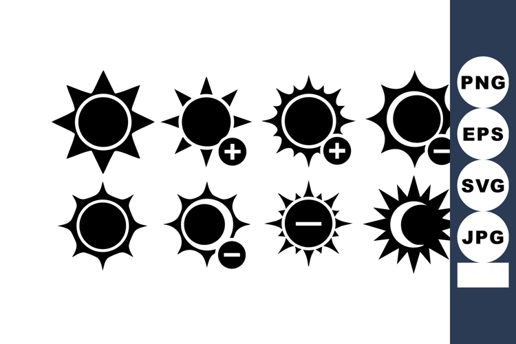 This vector file contains black sun icons featuring plus, minus, and crescent moon shapes, ideal for design or weather-related projects. The composition is clear and simple, conveying clarity.