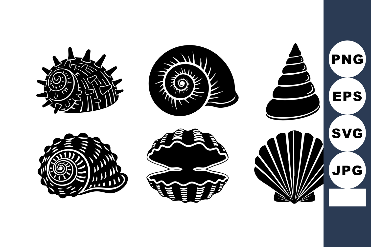 This vector features six black silhouette seashells with spiral and scallop shapes, perfect for marine-themed design and decoration projects. The style is simple and bold, creating a classic mood.
