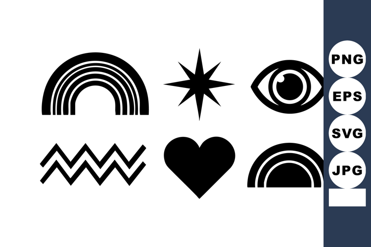 This vector file displays abstract black geometric symbols such as rainbows, heart, eye, star, and zigzag shapes in a simple minimalistic style. Design is modern and bold. Calm mood.