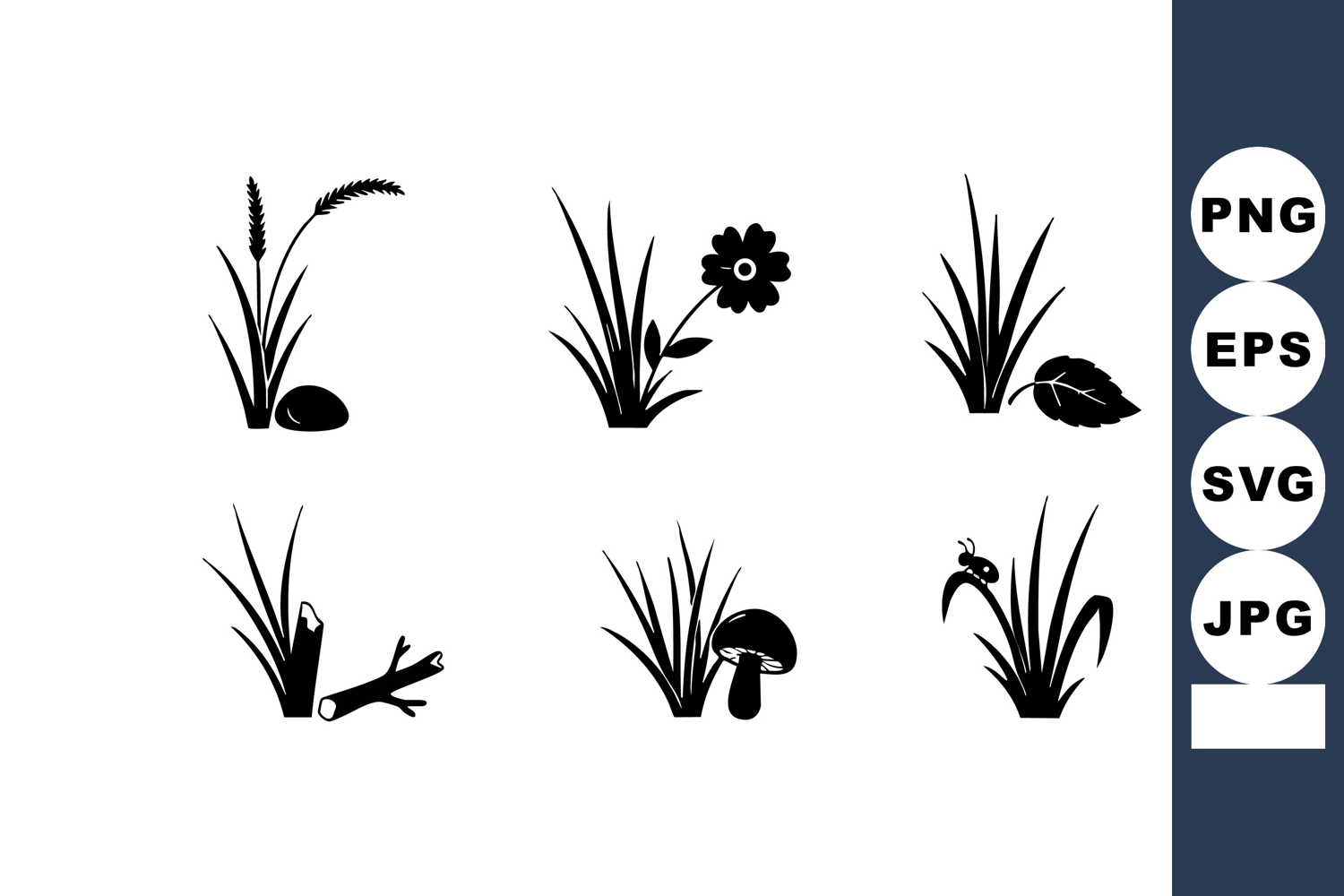Vector shows six wild grass silhouettes with flowers mushrooms stones and twigs in black for natural and creative design projects. Calm mood.