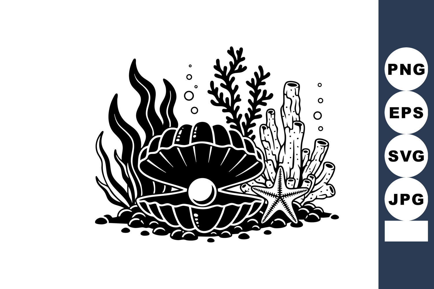 This vector shows an underwater scene with an open shell revealing a pearl, surrounded by seaweed, coral, and a starfish, rendered in black and white style for a classic marine mood.