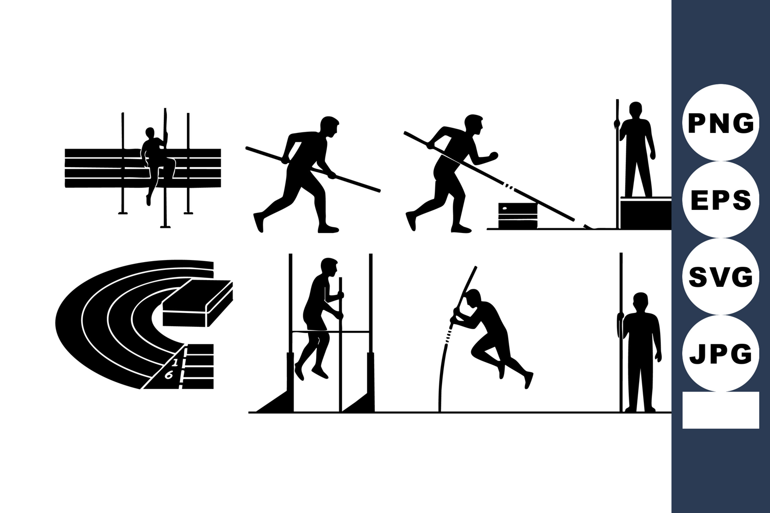 This vector presents black silhouettes of pole vault athletes in various jumping and preparing stances, emphasizing motion and athletic skill in a clean, minimal style. Energetic mood.
