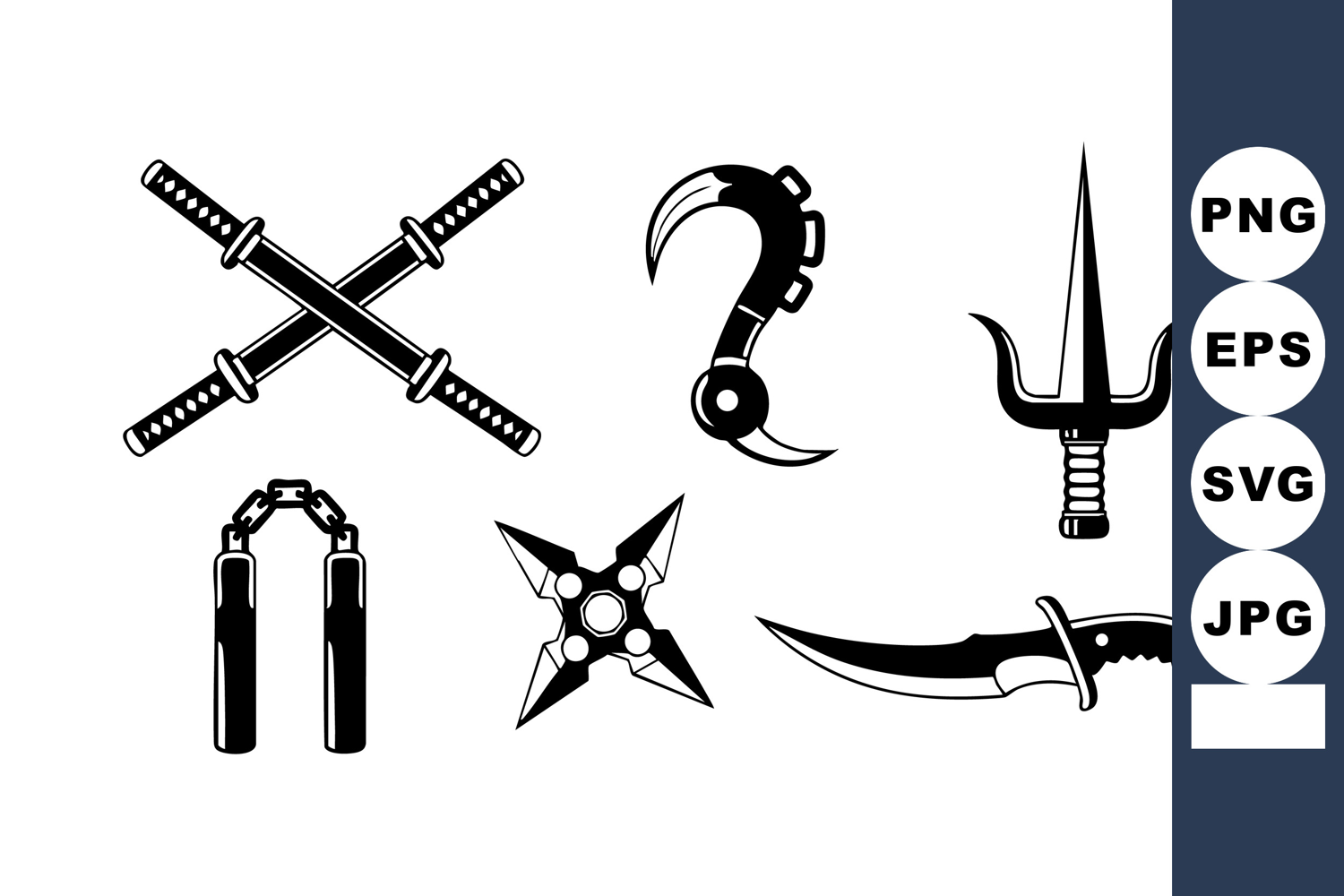 Various traditional ninja weapons including shuriken, kunai, kama, nunchaku, and dagger arranged in a vector style. Black silhouettes create a sharp and bold look. Dynamic and mysterious.