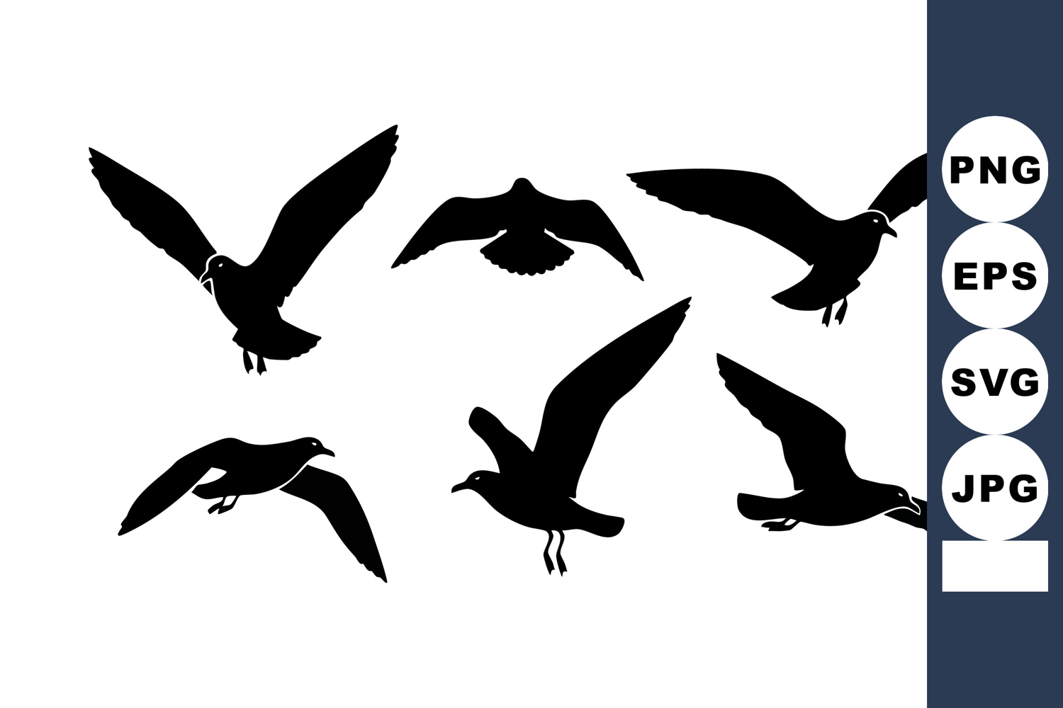 This vector image shows six black seagulls flying in various positions against a white background, capturing natural bird movement in minimalist style. Calm atmosphere.