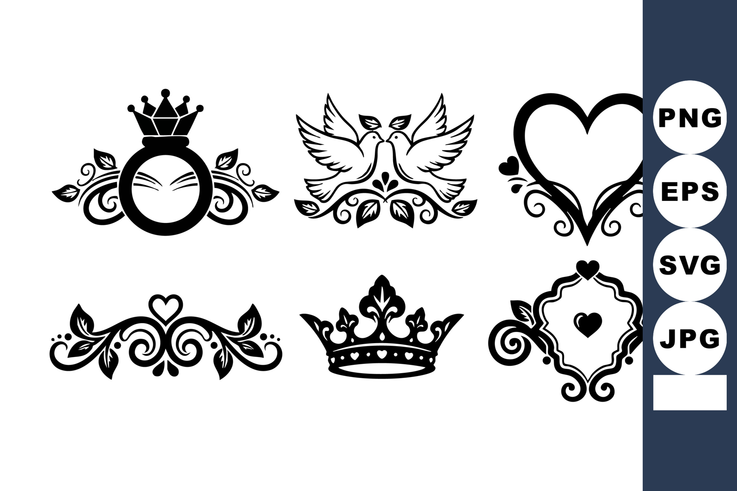 This vector features elegant black ornamental vintage decorative elements including crowns, hearts, and doves, perfect for creative design projects with a classic touch, stylish and graceful.