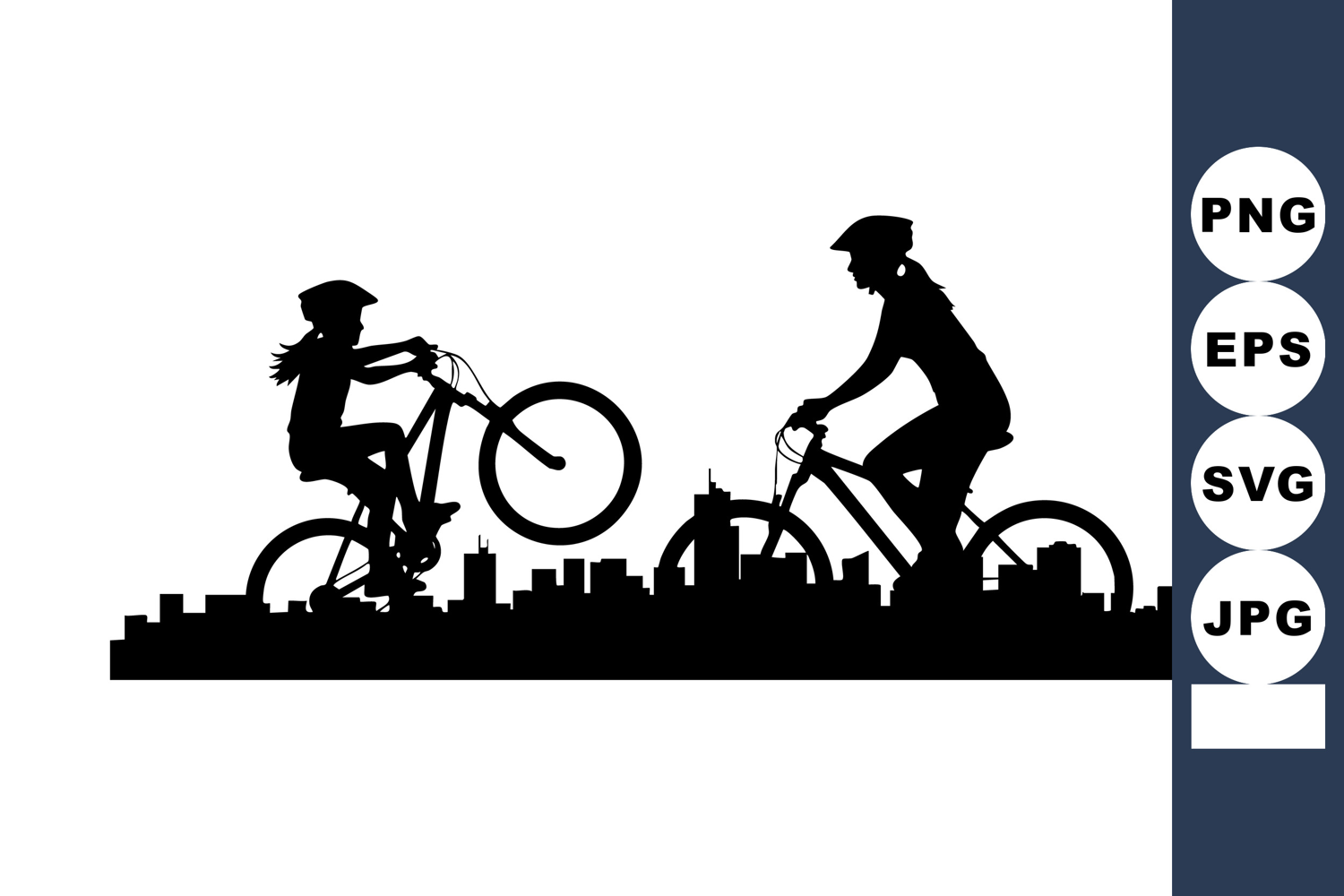 Black silhouette of two children cycling with one performing a wheelie against a city skyline, capturing playful energy and outdoor fun in a minimalist style. Cheerful mood.
