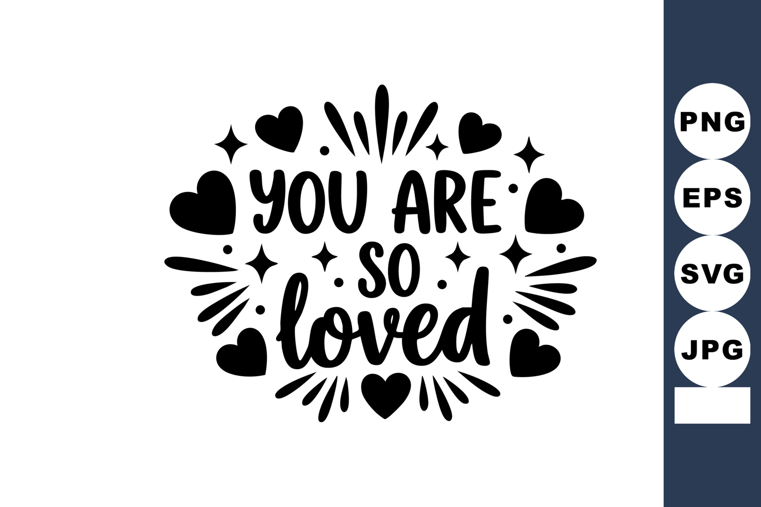 This vector design features the phrase You Are So Loved surrounded by hearts and sparkles, conveying a warm and uplifting message with a clean black silhouette style. Cheerful mood.