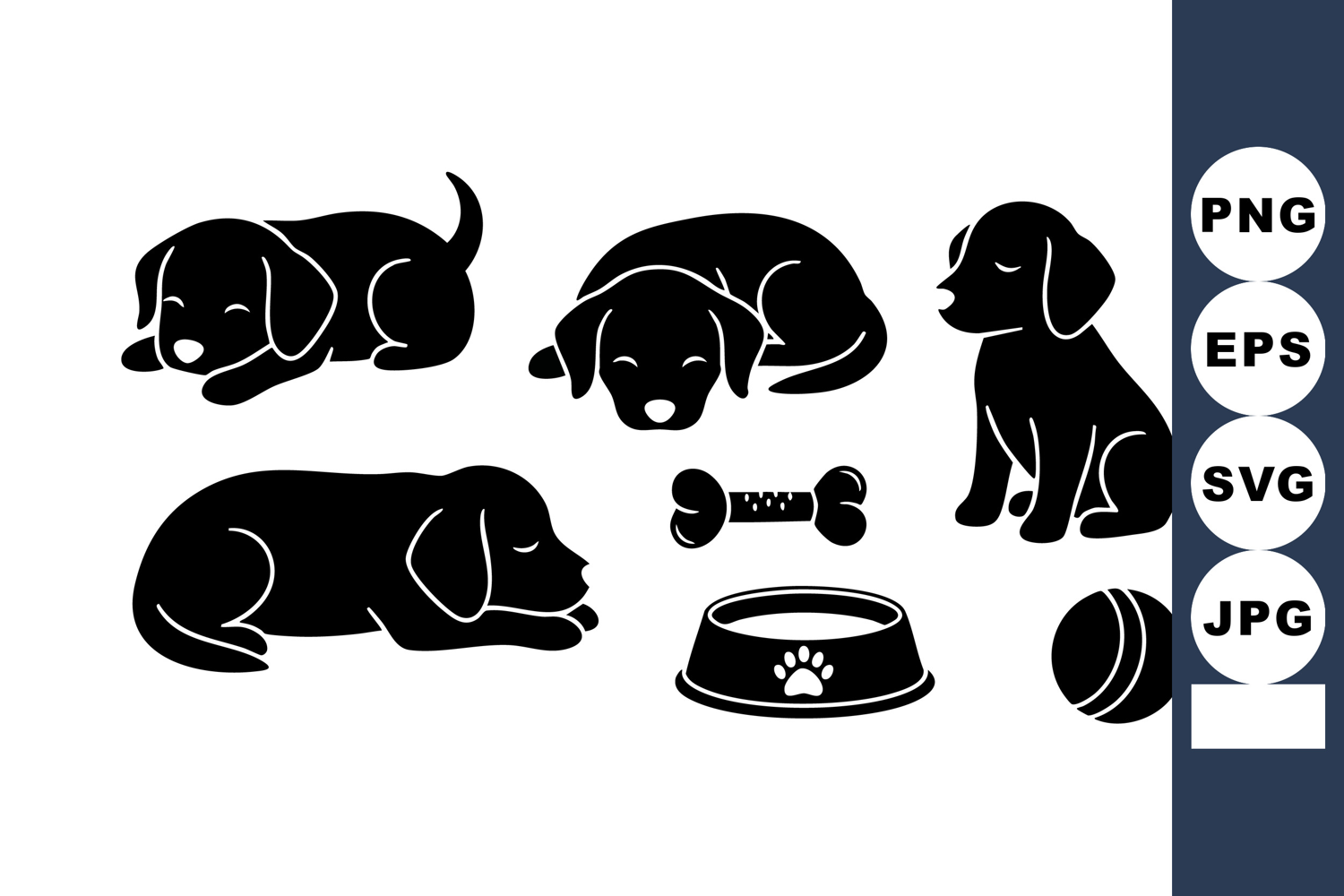 This vector features five puppy dog silhouettes with pet accessories including a bone, ball, and bowl. It presents a playful and friendly mood.