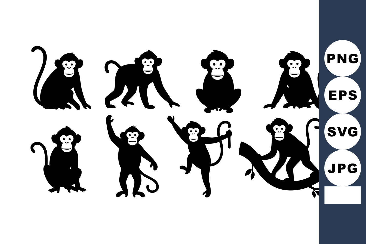 This vector set features black monkey silhouettes in different playful and curious poses, perfect for nature or wildlife projects. The style is simple and bold, creating an energetic mood.