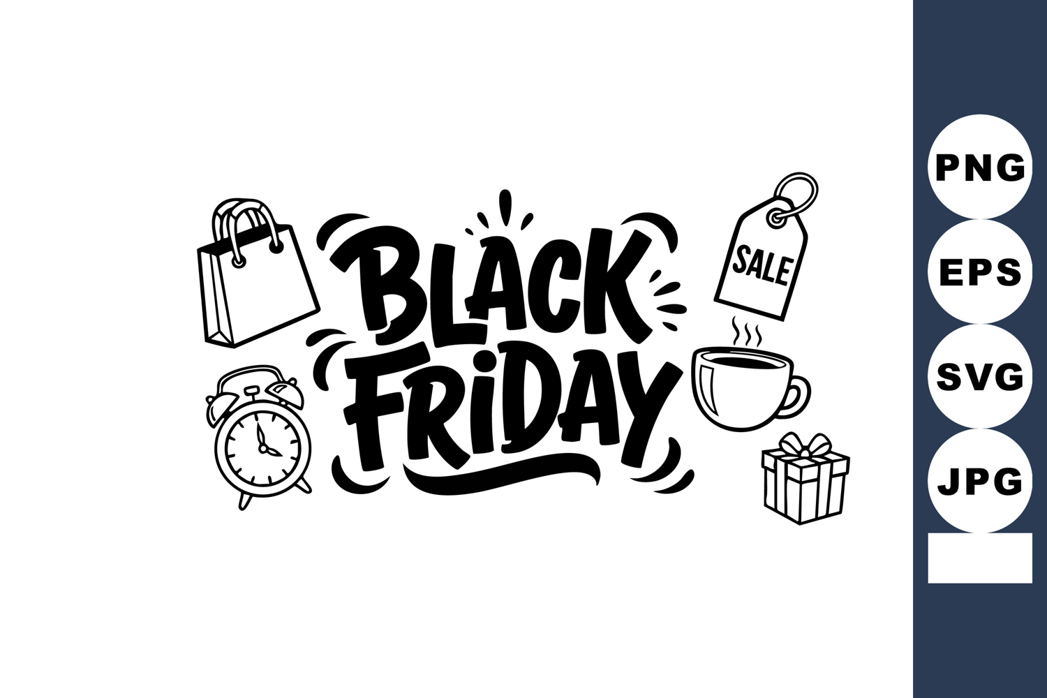 This vector design shows Black Friday text surrounded by icons of a shopping bag, alarm clock, coffee cup, sale tag, and gift box. It captures the busy shopping mood. Energetic.