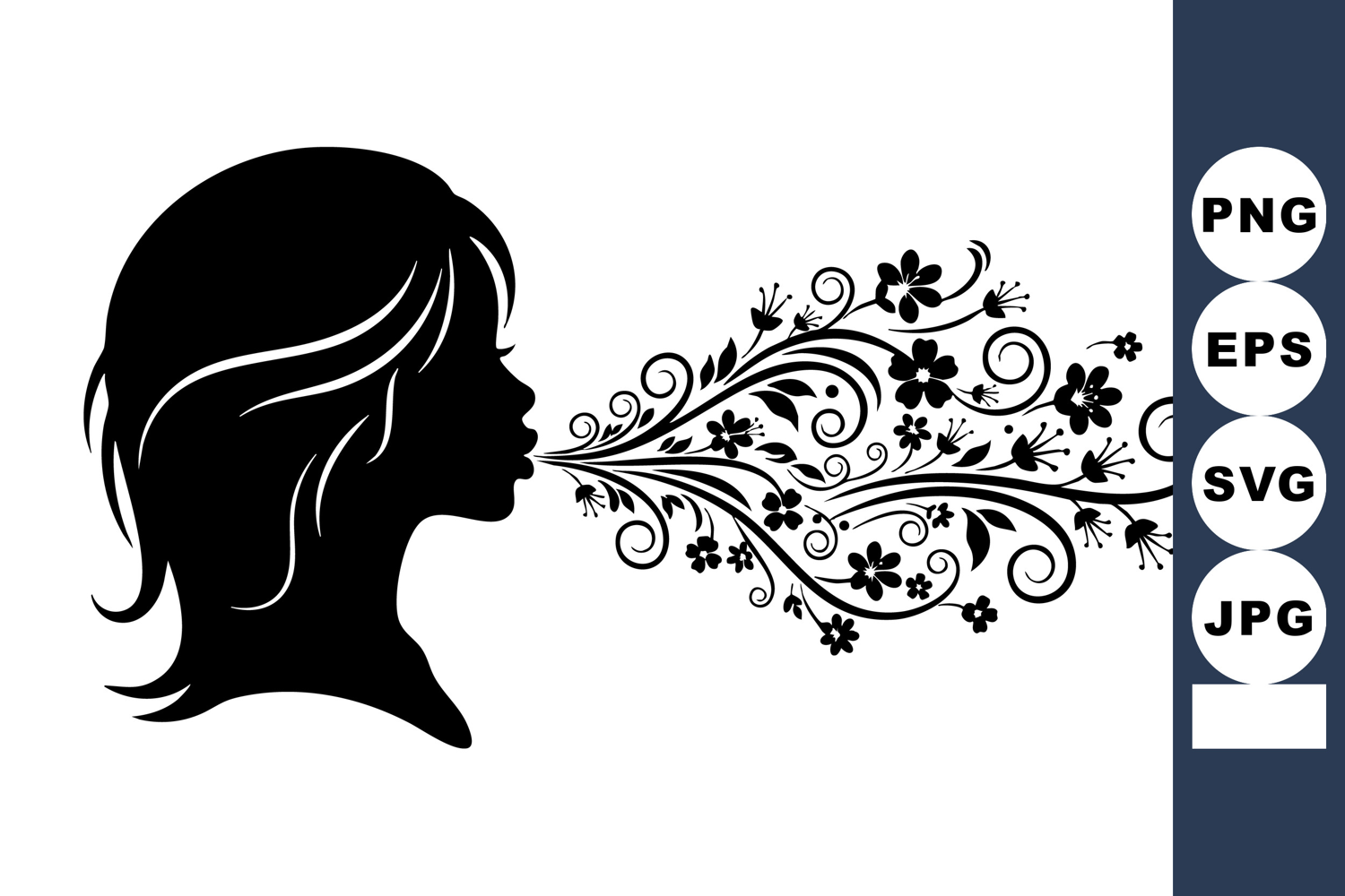 Black silhouette of a woman with flowing hair blowing floral patterns, creating an artistic and graceful effect in vector style. Elegant and creative mood.