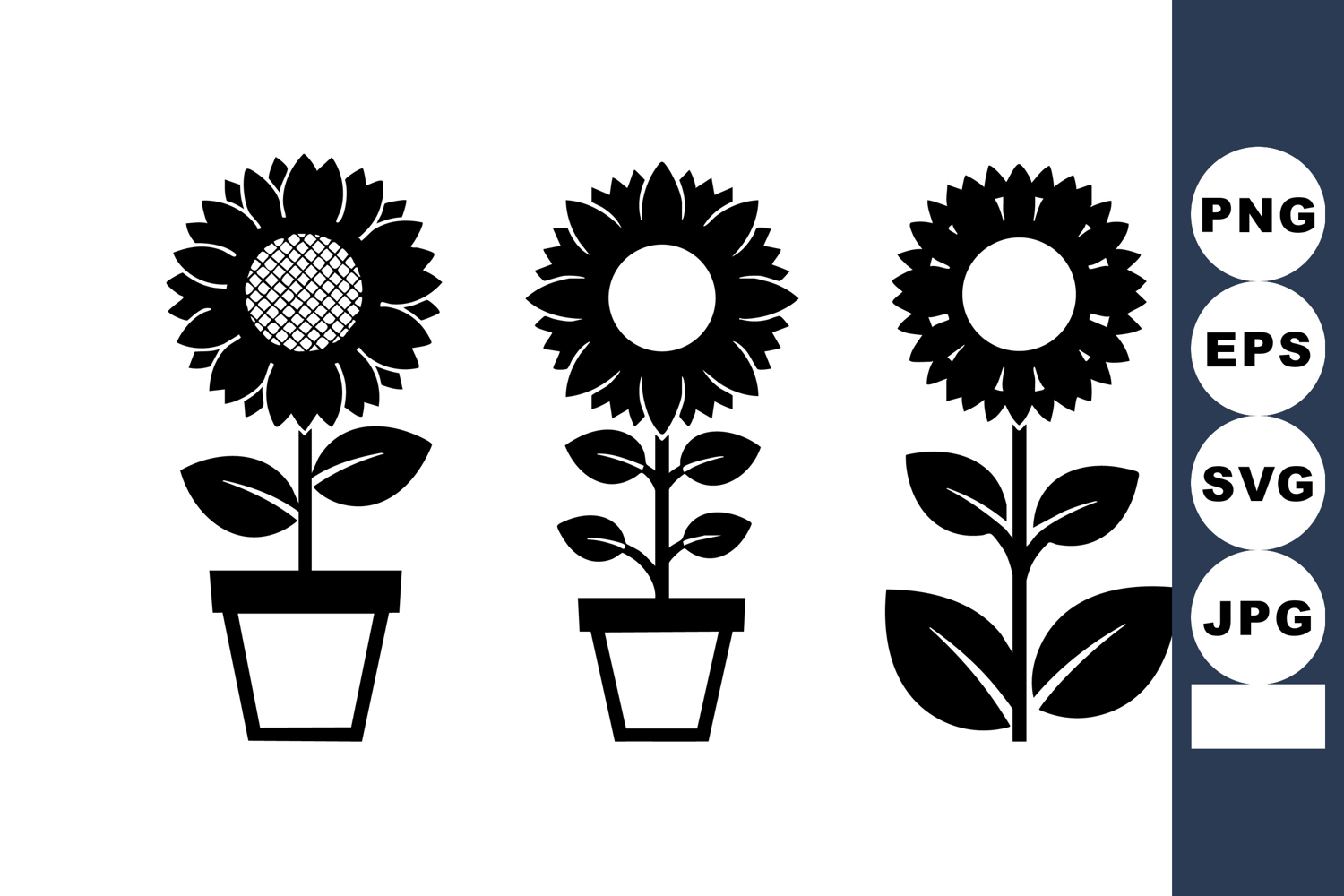 This vector set shows three sunflower silhouettes with varied leaf and pot styles in black and white. It features simplicity and nature-inspired design, ideal for creative projects. Calm and clean.