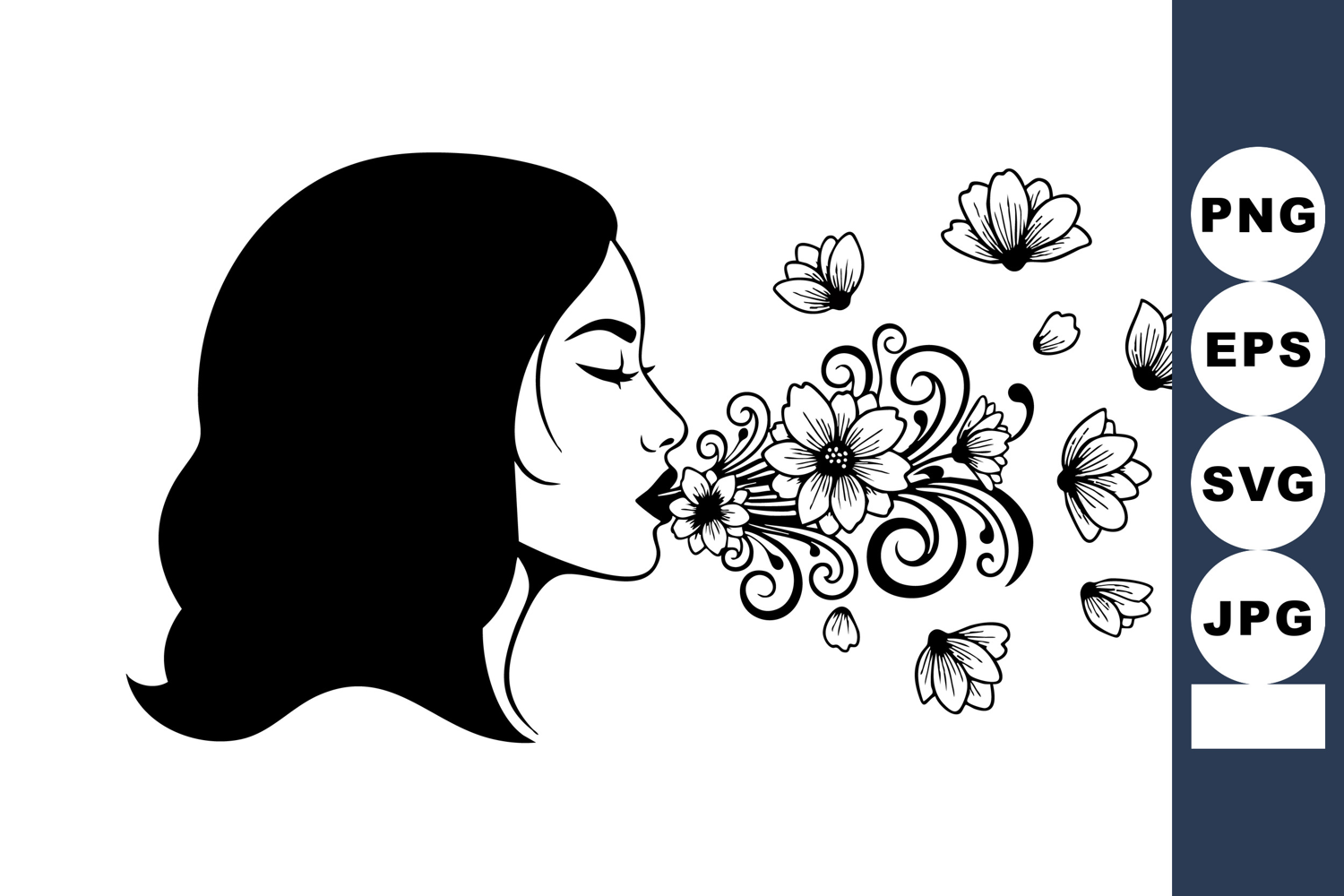 Woman depicted in black silhouette blowing delicate flowers and swirling floral elements, symbolizing creativity and nature in a minimalist style. Calm and artistic mood.