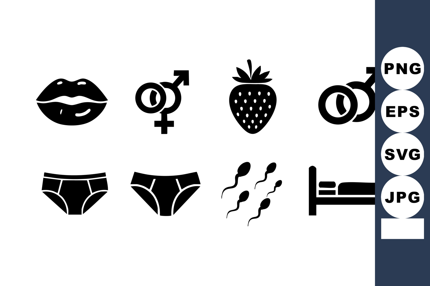 This vector features male and female gender symbols, lips, strawberry, underwear, sperm, and bed icons in black silhouette style, conveying themes of gender and sexuality with clarity and simplicity. Bold and symbolic.