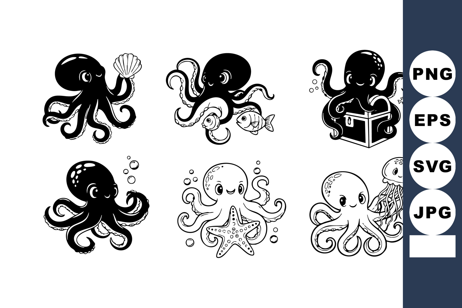 This vector features six adorable octopus cartoons interacting with sea animals and objects in monochrome style, creating a fun and lively underwater scene. Cheerful mood.