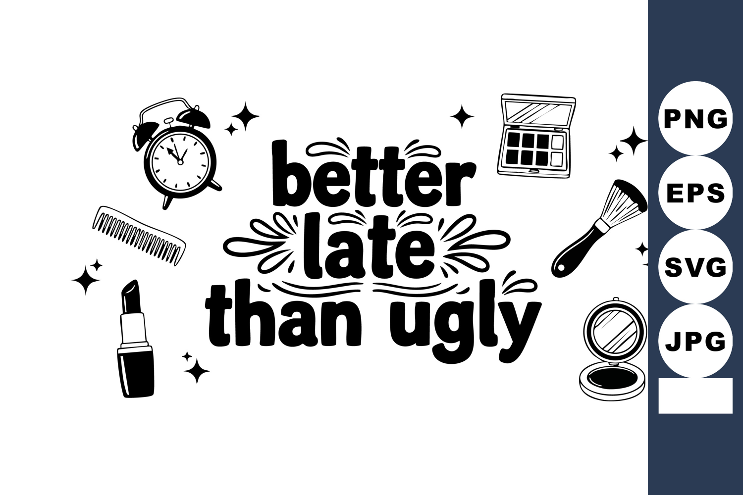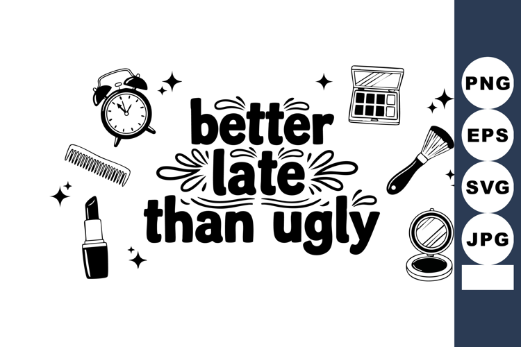 Vector design featuring the phrase better late than ugly surrounded by makeup icons such as lipstick, brush, comb, clock, and compact mirror in black and white, stylish and playful mood.