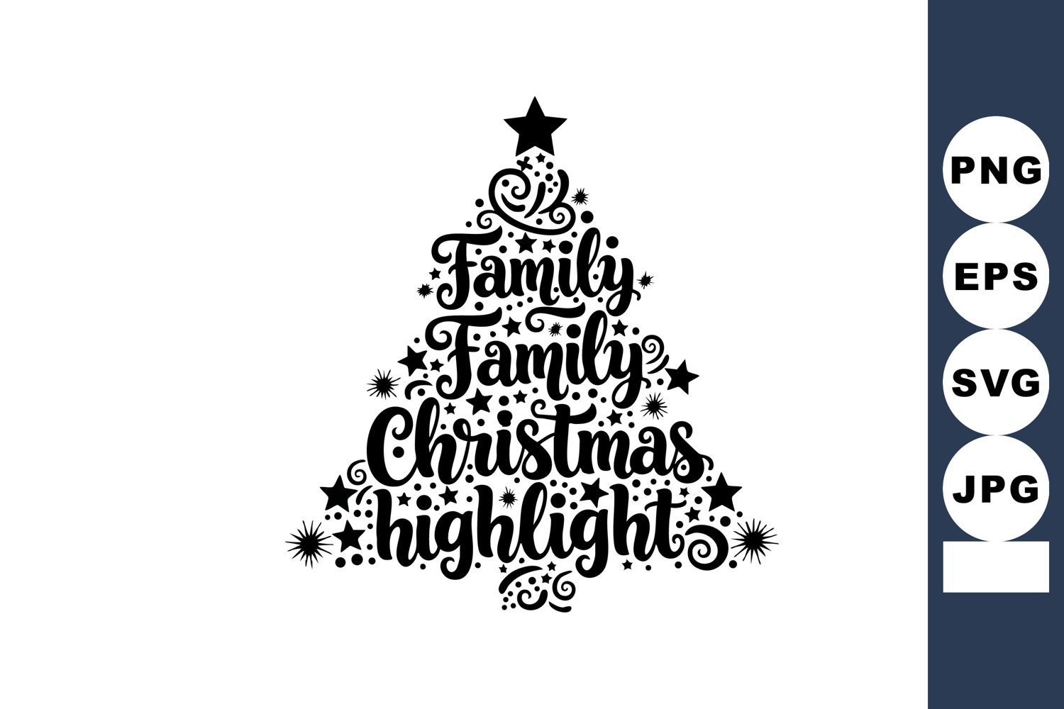 Black silhouette Christmas tree formed by decorative family and Christmas words, surrounded by stars and swirls, creating a festive and elegant holiday mood.