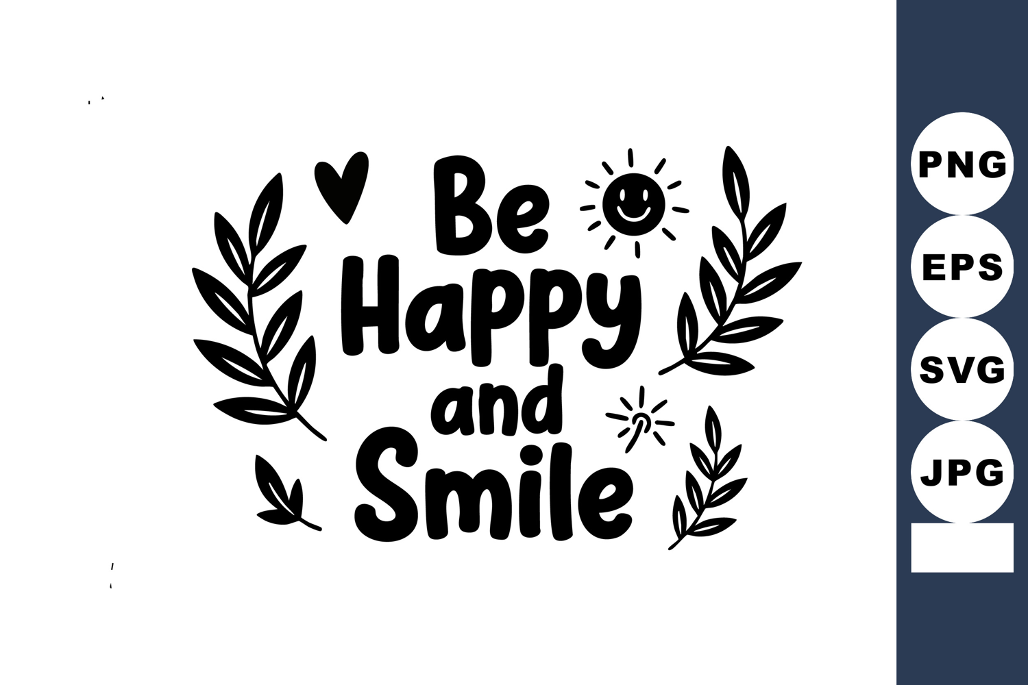 Illustration features a positive motivational quote Be Happy and Smile with simple sun, heart, and leaf decorations creating an uplifting and cheerful mood.