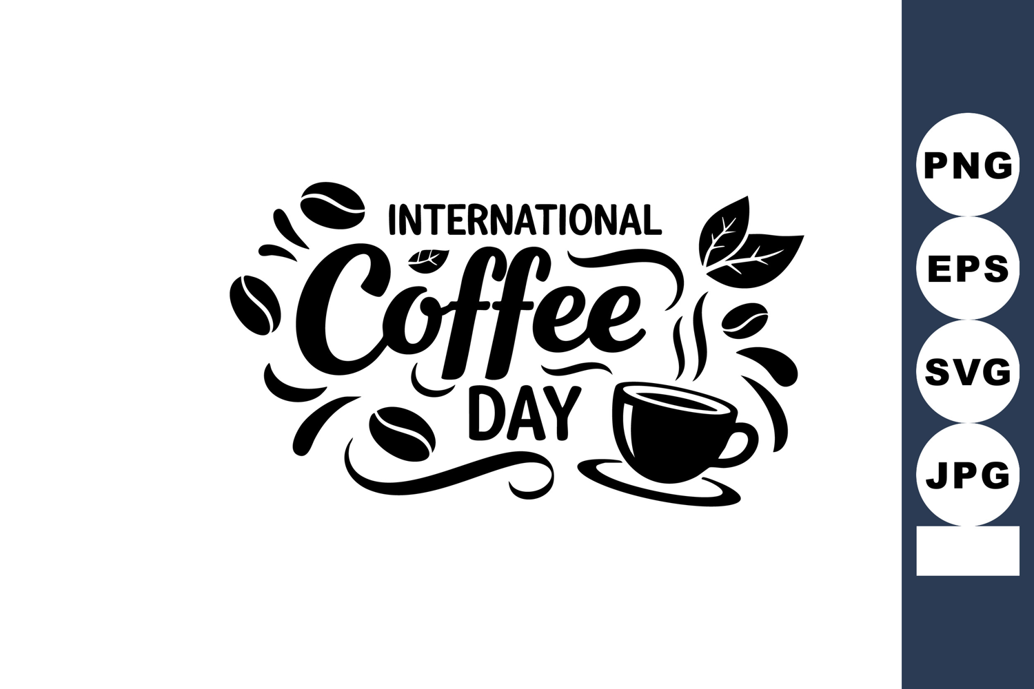 This vector design features coffee beans, a steaming cup, and leaves celebrating International Coffee Day with a bold black and white style. The mood is energetic and festive.