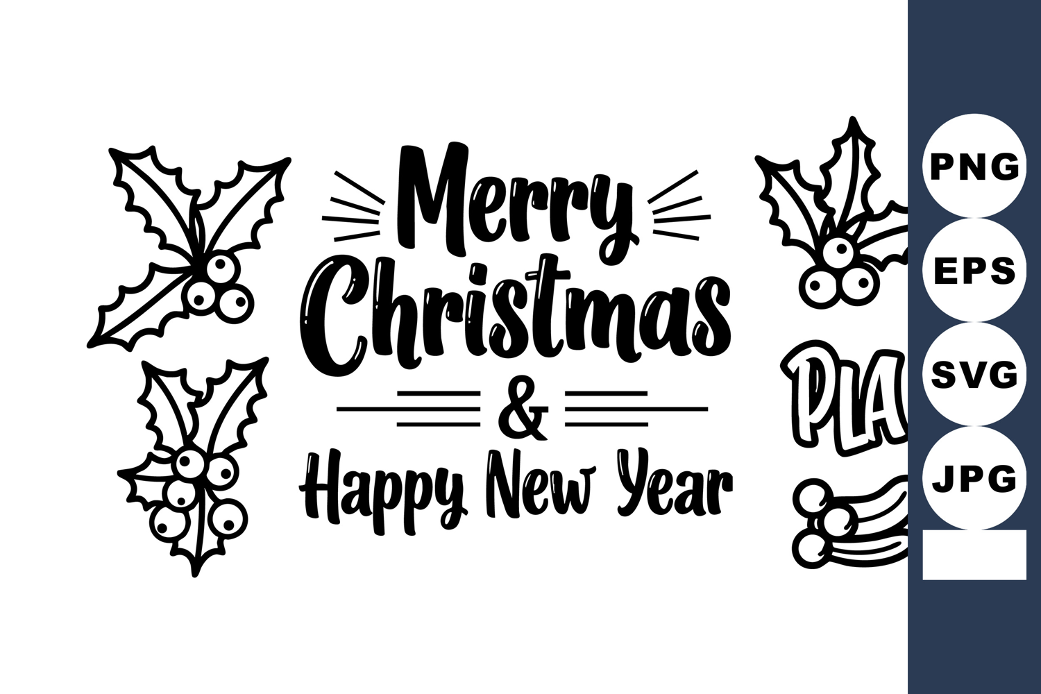 This vector design features Merry Christmas and Happy New Year text decorated with holly leaves and berries in black and white, creating a festive and elegant holiday mood.