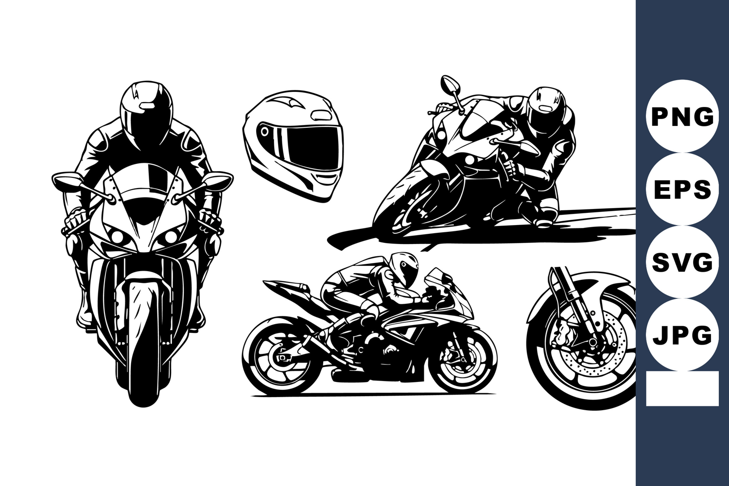 This vector features motorcycle racing scenes including rider poses, helmet, and motorbike parts in a bold black and white style, conveying speed and adrenaline with dynamic energy.