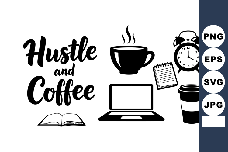This vector shows a motivational hustle and coffee phrase with coffee cup, laptop, alarm clock, notebook, and book icons, symbolizing productivity and work energy in black silhouette style. Energetic mood.