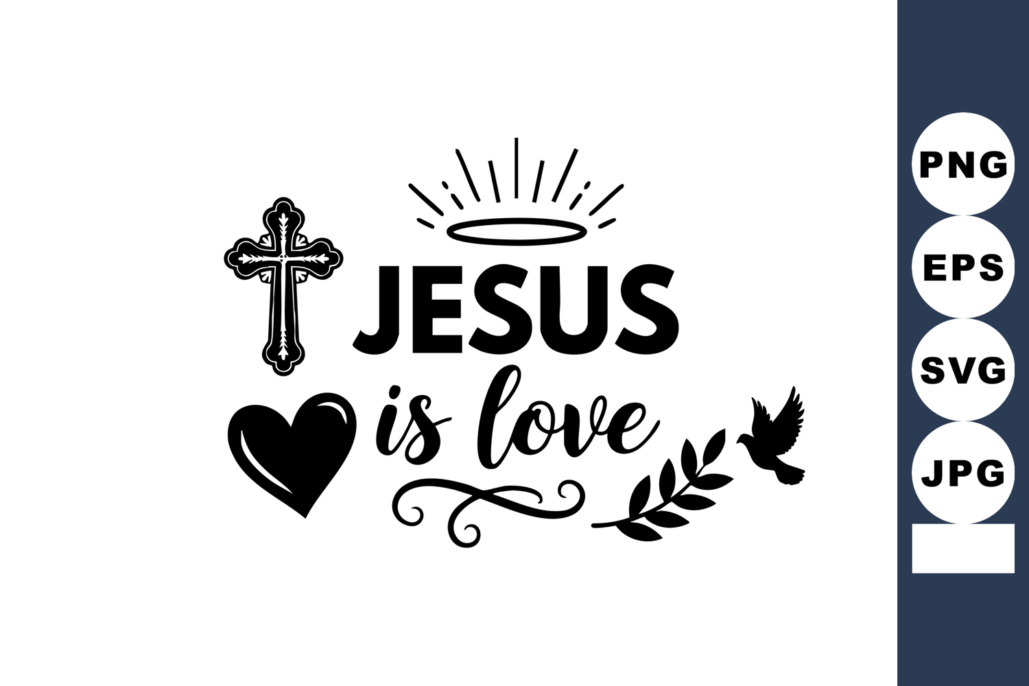 This vector design features the phrase Jesus is love with a cross, heart, dove, and olive branch, symbolizing faith and hope in Christianity, evoking peaceful and uplifting emotions.