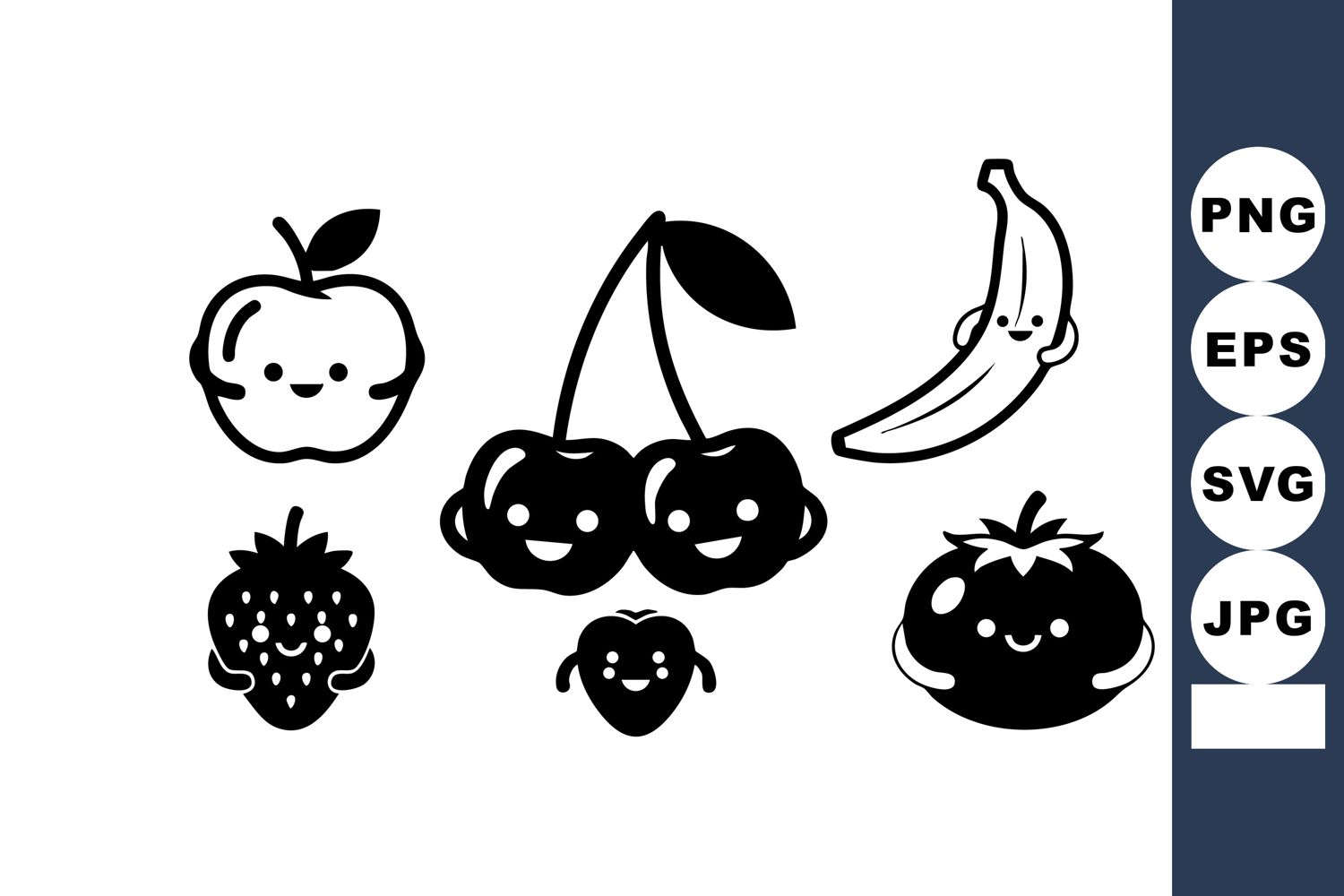 This vector illustration features adorable cartoon fruit faces including apple, cherry, banana, strawberry, raspberry, and tomato in black and white style, cheerful mood.