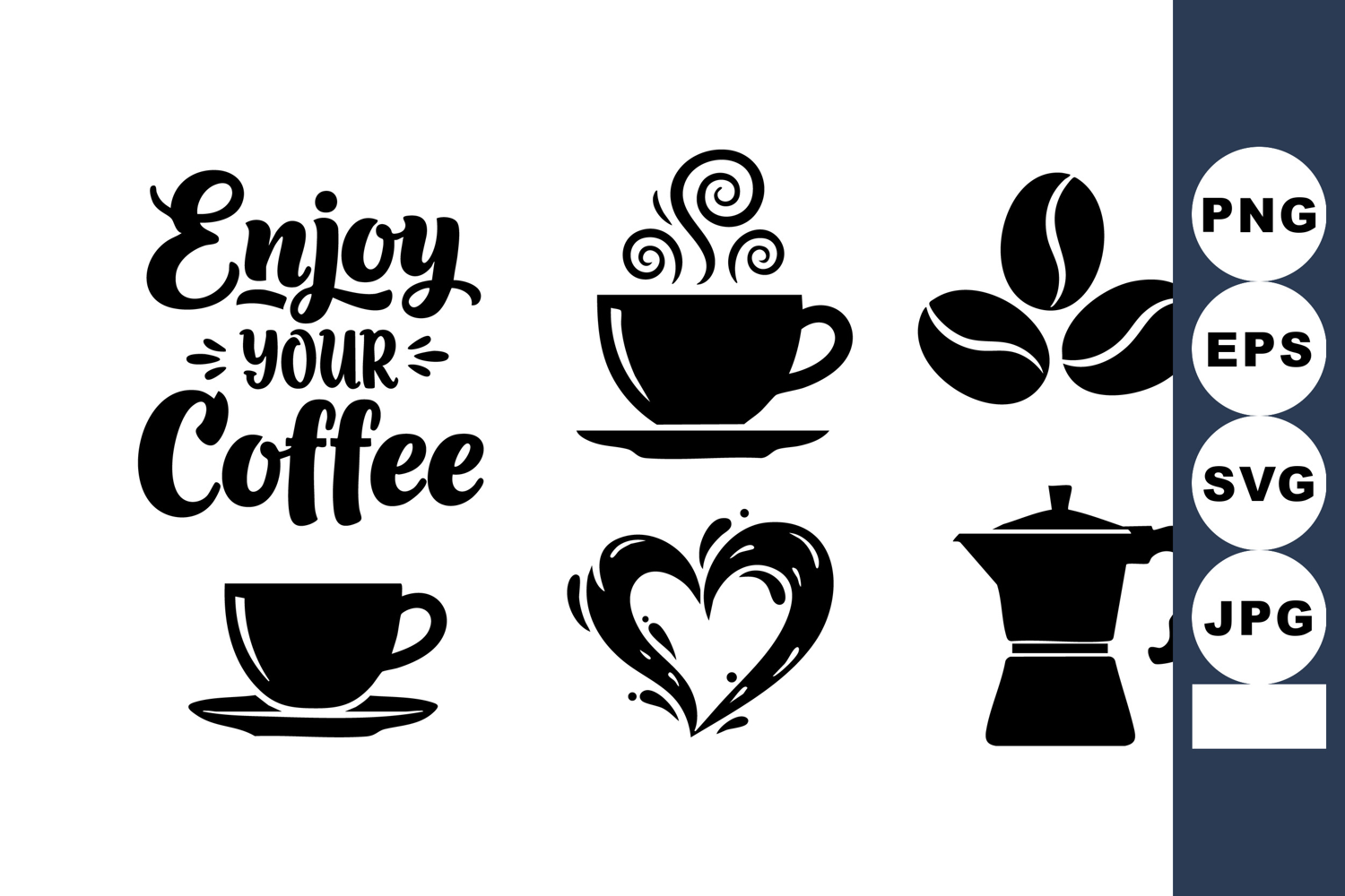 This vector image presents coffee cup, beans, moka pot, and heart steam designs with enjoy your coffee text in black silhouette style. The illustration conveys warmth and relaxation mood.