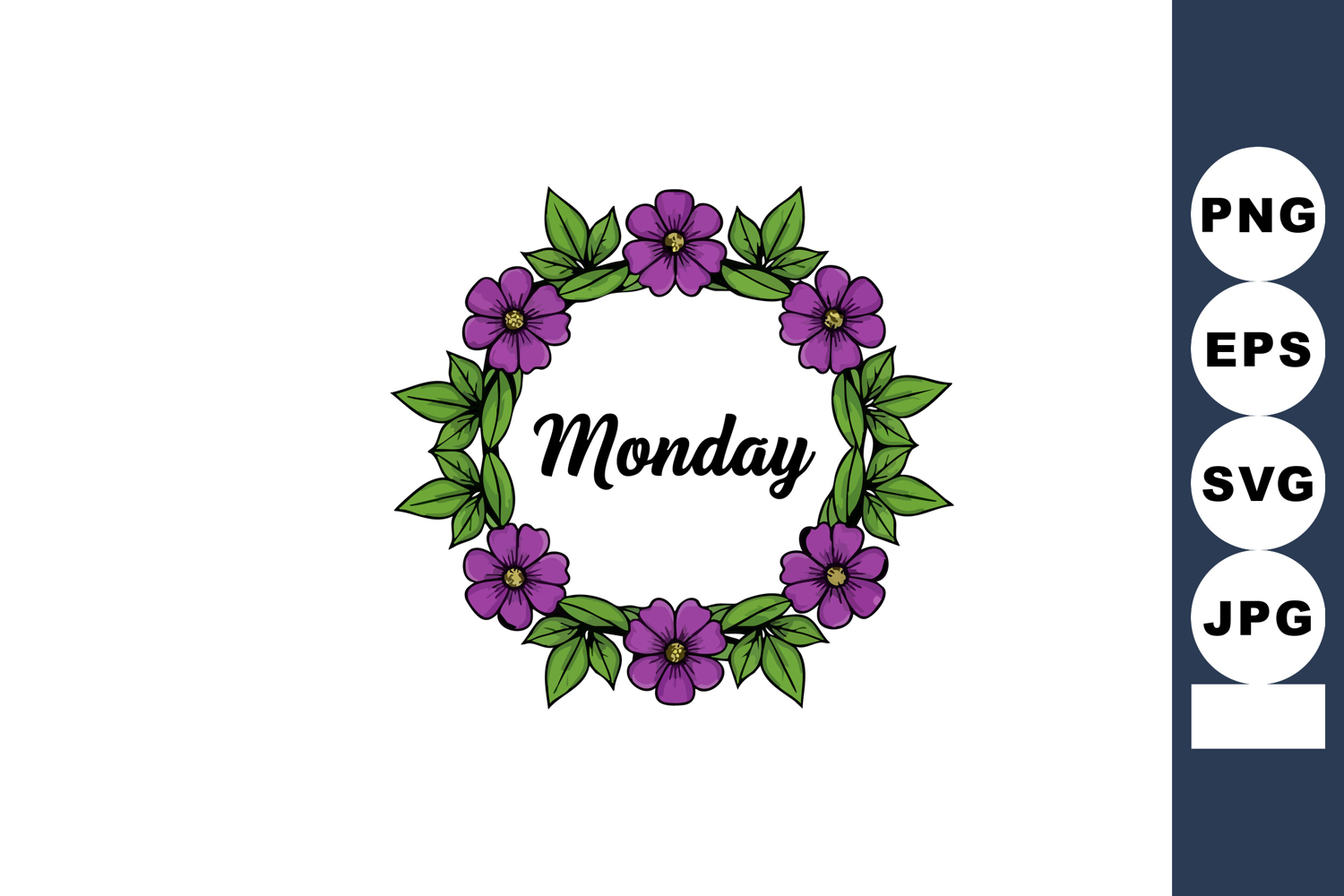 This vector shows a circular wreath of purple flowers and green leaves framing the word Monday in black script font, ideal for planners or invitations, bright and cheerful mood.
