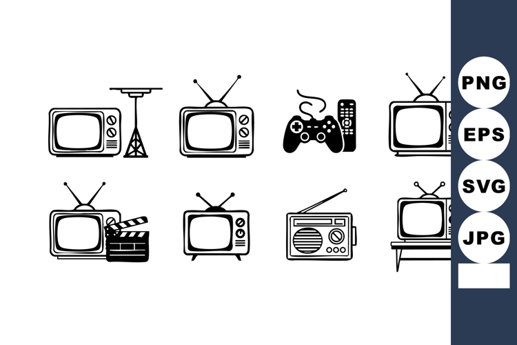This vector set features retro televisions, a game controller, radio, remote, and clapperboard icons in black and white, capturing vintage media essentials with a nostalgic feel.