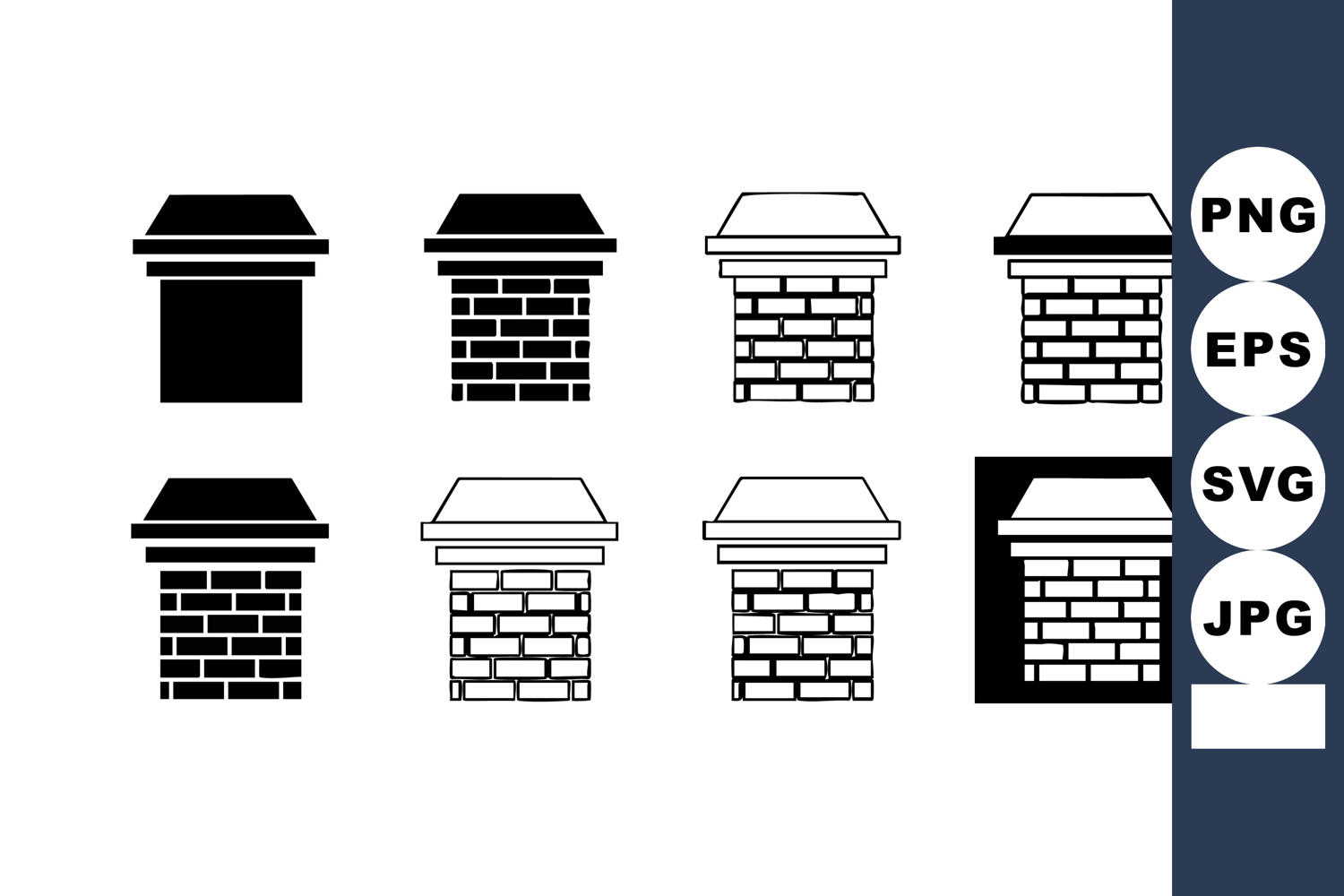 This vector image shows eight brick chimney icons in black and white silhouette style, illustrating various roof chimney shapes for architectural and construction use, simple and clear. Calm.